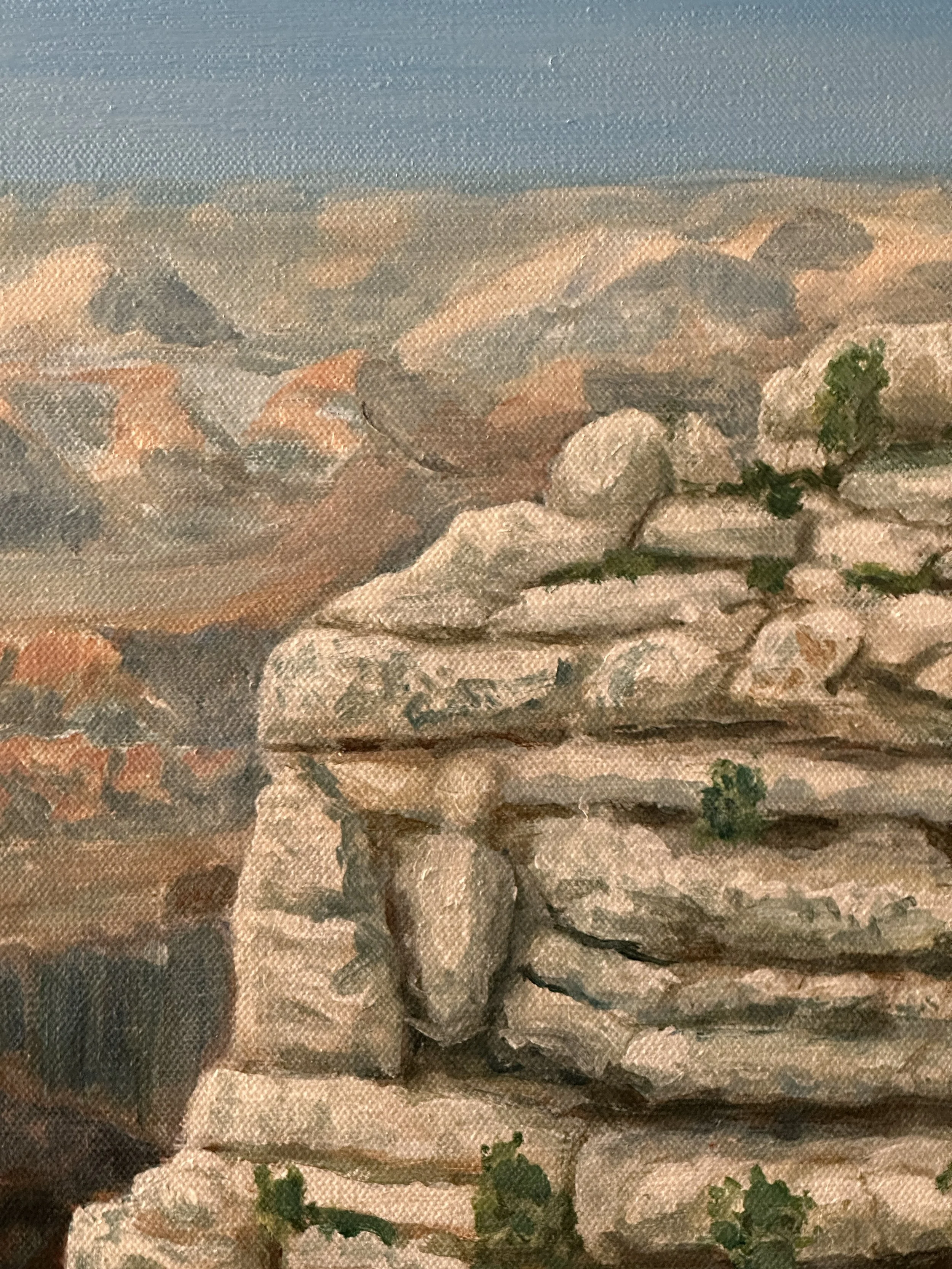 Hiking the south rim of the Grand Canyon you come on this overlook. It is one of those perfect pictures that happen to catch your eye. I take a lot of pictures but this one stood out and I wanted to interact with it more. I decided to paint it using acrylic paint on a 24”x36” canvas.